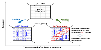 5.當(dāng)溫度降到居里點以下時,MLCC會發(fā)生老化。偶極子切換到90°域以減輕內(nèi)部機械應(yīng)力。