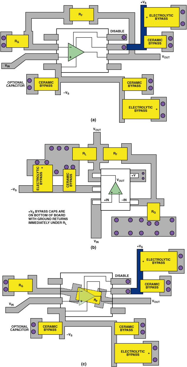 對(duì)于高速運(yùn)算放大器和任何其他高速電路,繞過(guò)放大器的電源端子以最小化噪聲是PCB設(shè)計(jì)過(guò)程的一個(gè)關(guān)鍵方面。有兩種常用的繞過(guò)高速運(yùn)算放大器的配置。