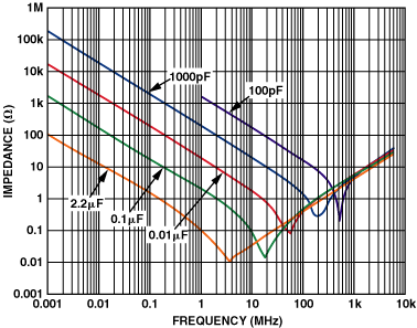 并聯(lián)不同的電容值有助于確保電源管腳在寬頻帶上看到低交流阻抗。這在運(yùn)放電源抑制(PSR)逐漸消失的頻率下尤為重要。電容有助于補(bǔ)償放大器的PSR下降。在多個(gè)的頻率內(nèi)保持低阻抗接地路徑將防止不需要的噪聲進(jìn)入運(yùn)放。圖1顯示了多個(gè)并聯(lián)電容器的優(yōu)點(diǎn)。在較低的頻率下,較大的電容器提供一個(gè)低阻抗的接地路徑。一旦這些電容器達(dá)到自諧振,電容質(zhì)量下降,電容器成為電感。這就是為什么使用多個(gè)電容器很重要的原因:當(dāng)一個(gè)電容器的頻率響應(yīng)衰減時(shí),另一個(gè)電容器的頻率響應(yīng)變得明顯,從而在多個(gè)的頻率內(nèi)保持低交流阻抗。