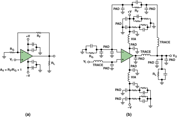 寄生效應(yīng)會(huì)對(duì)你的電路中造成嚴(yán)重破壞。它們是隱藏在高速電路中的雜散電容和電感。它們包括由封裝引線和多余的布線長(zhǎng)度形成的電感器;焊盤對(duì)地、焊盤對(duì)電源平面和焊盤對(duì)跡線電容器;與過(guò)孔的相互作用,以及更多的可能性。圖3(a)是一個(gè)典型的非旋轉(zhuǎn)運(yùn)放的示意圖。然而,如果要考慮寄生元件,同一電路將如圖3(b)所示。