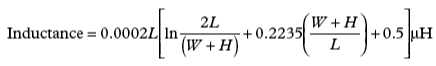 條帶狀電感是另一個(gè)需要考慮的寄生因素,它是由線長(zhǎng)過(guò)長(zhǎng)和缺少接地平面引起的。公式2給出了跟蹤電感的公式。見(jiàn)圖6