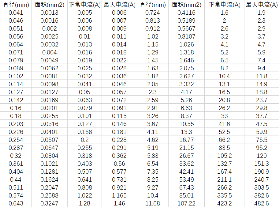 在電路設(shè)計(jì)的過程中,我們需要用到排線、轉(zhuǎn)接線等等;實(shí)際設(shè)計(jì)過程中,導(dǎo)線的線徑不可能無限制的大,因電路設(shè)計(jì)排線、穿線受到結(jié)構(gòu)的限制,且為了節(jié)省成本考慮,電路設(shè)計(jì)中的導(dǎo)線盡可能的細(xì),下面就給出常溫(25)下線徑(銅線)與電流的關(guān)系,直接上干貨