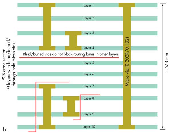 6.使用內部層布線信號的能力是使用較小的盲孔和掩埋過孔的重要好處。但是,應在此利益與電路板的額外成本之間進行權衡。